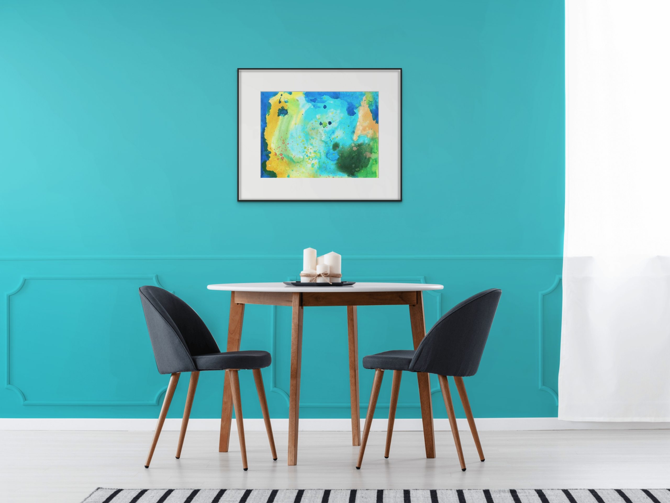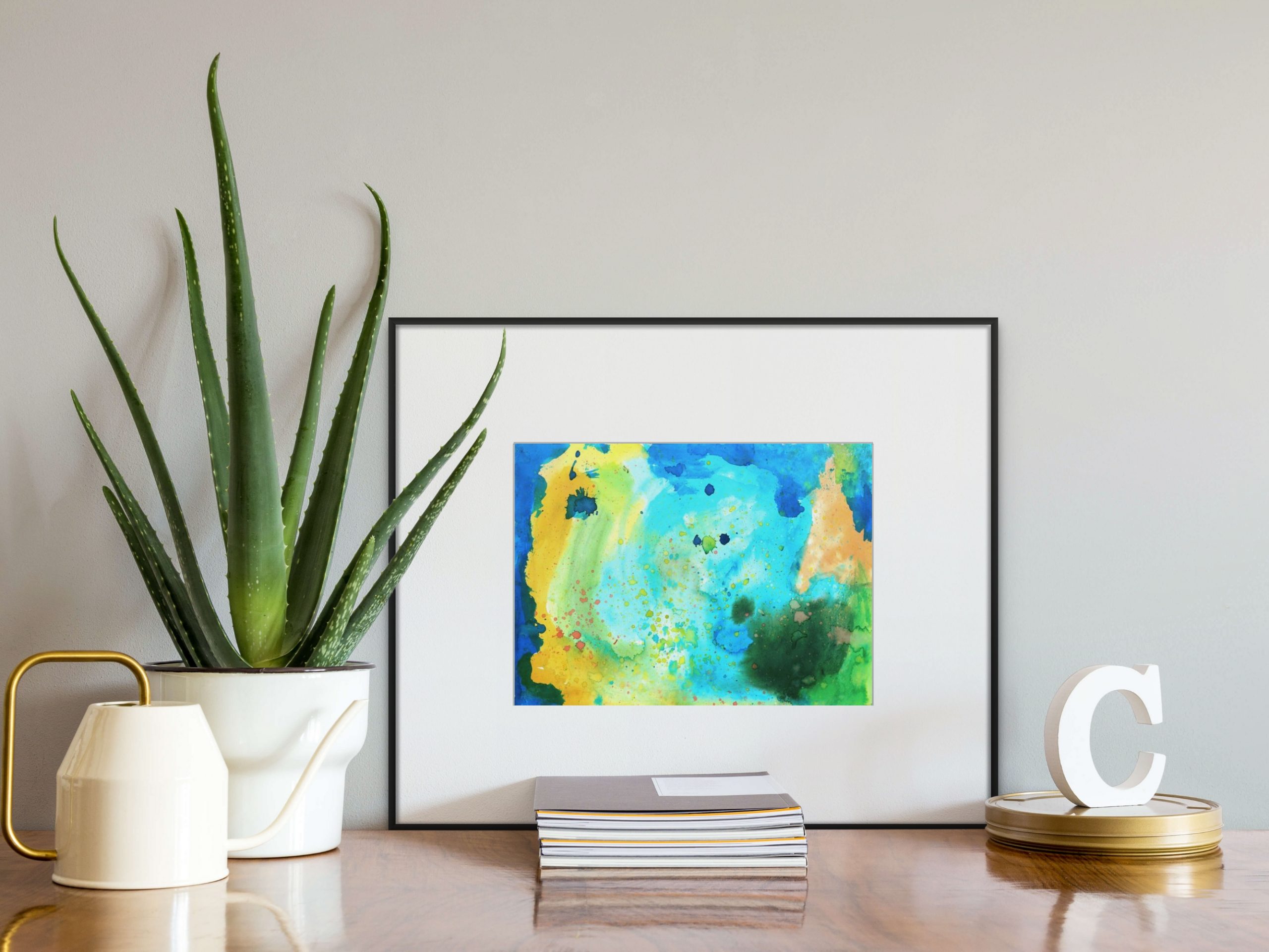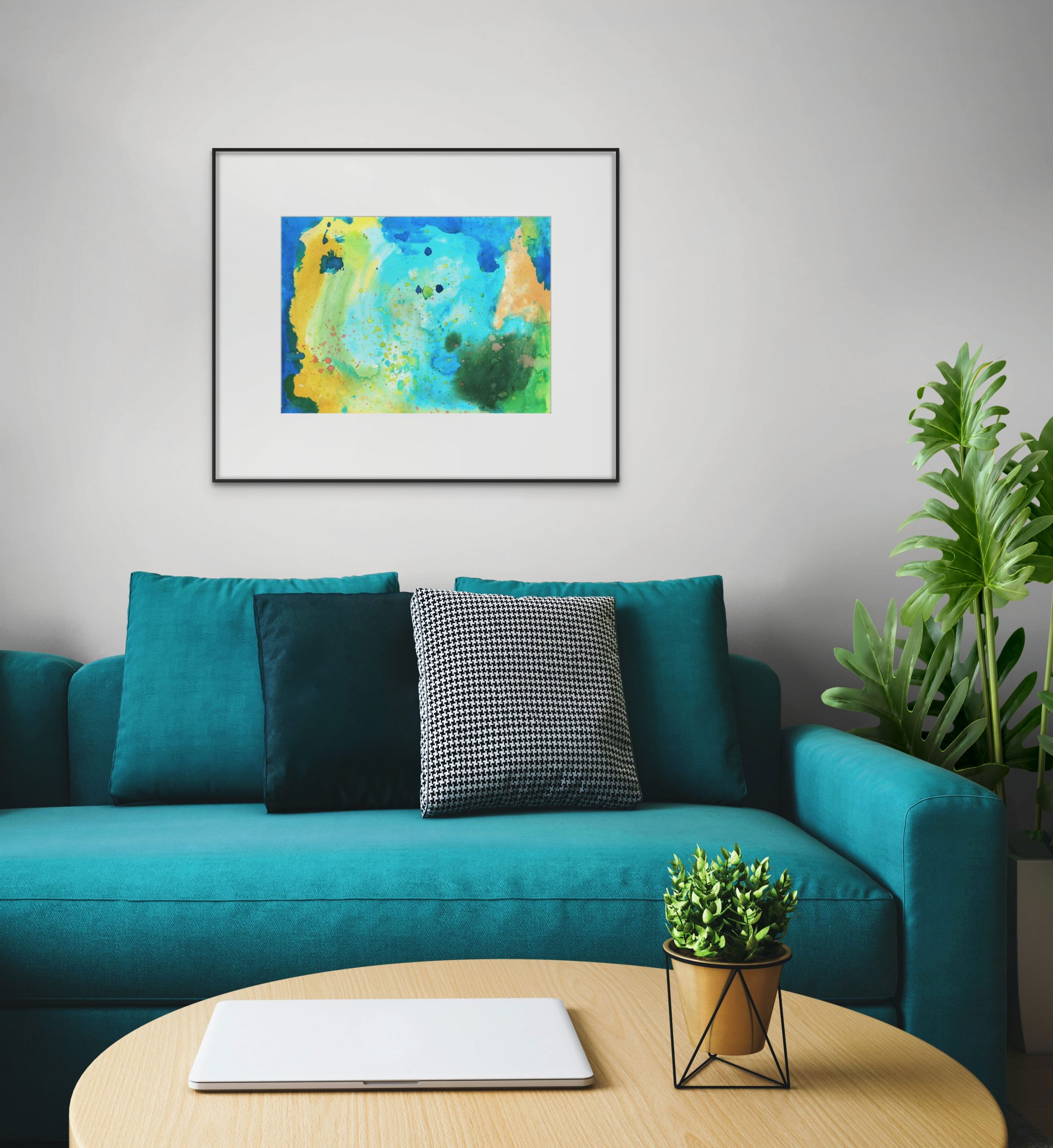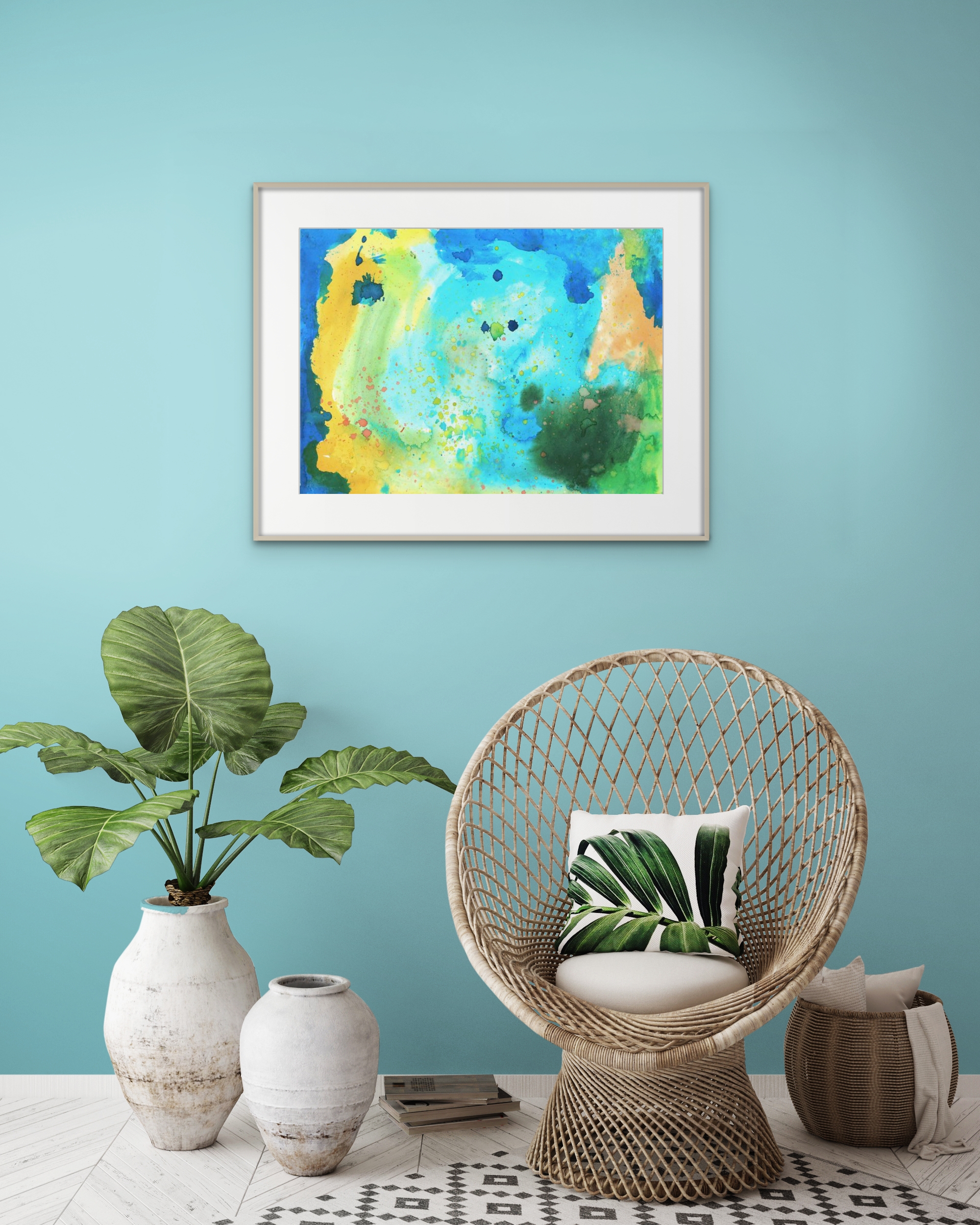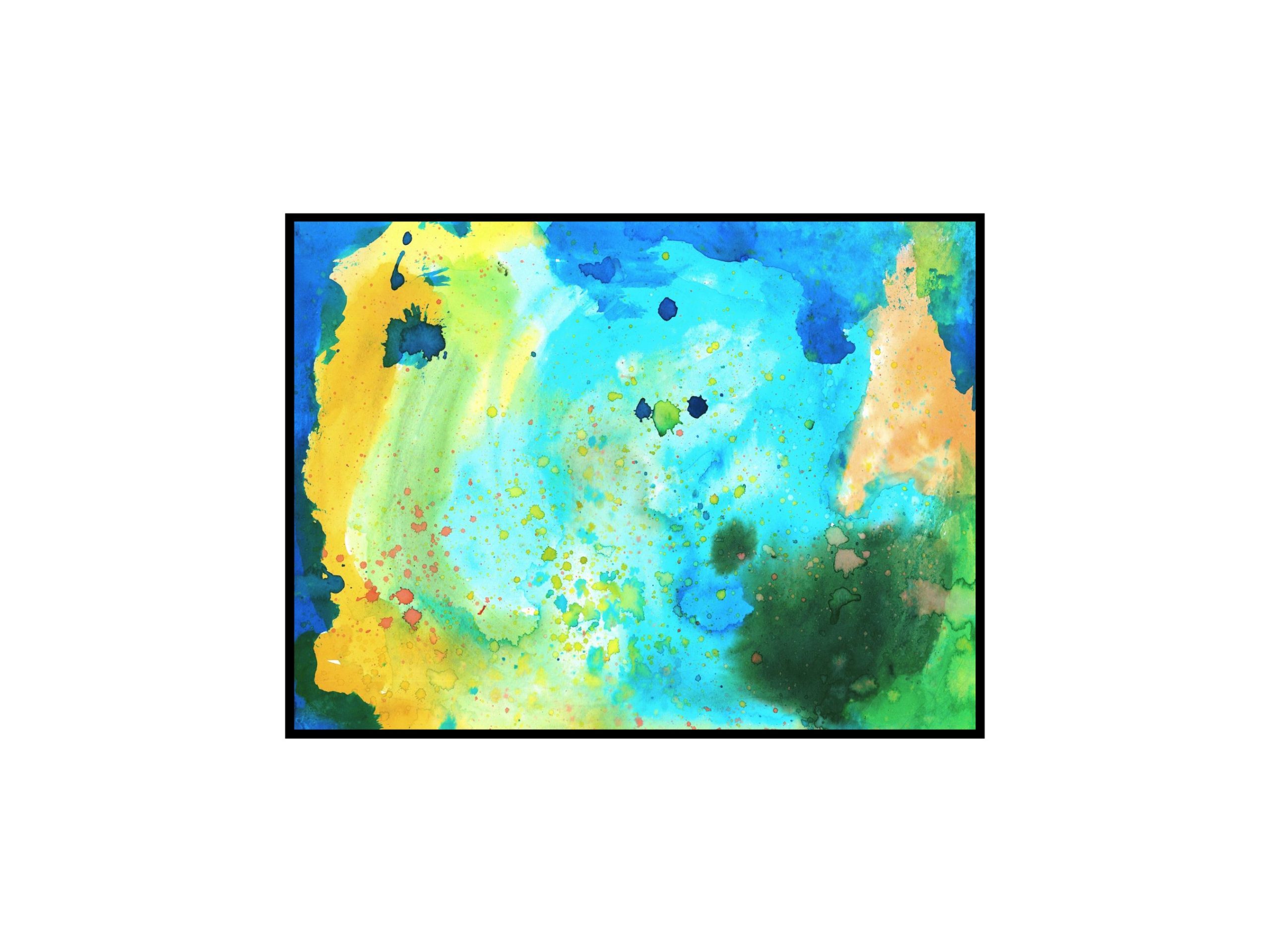 “Surf’s Up” is a colorful and vibrant art print made from an original watercolor painting. This abstract painting was created by Elijah Weeks at the age of 5. This print features vibrant shades of blue, yellow and green with splashes of orange. The swirling nature of the painting and the bold blue shades reminded us of a sunny beach scene, so we’ve named this painting Surf’s Up.